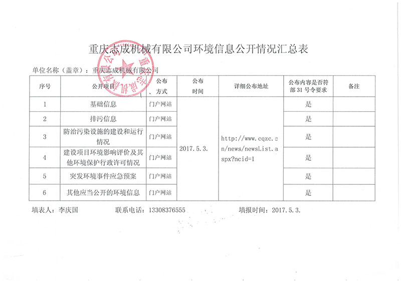 2017重慶志成機械有限公司環境信息公開表
